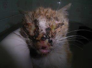 Gata abandonada con rinotraqueitis infecciosa.